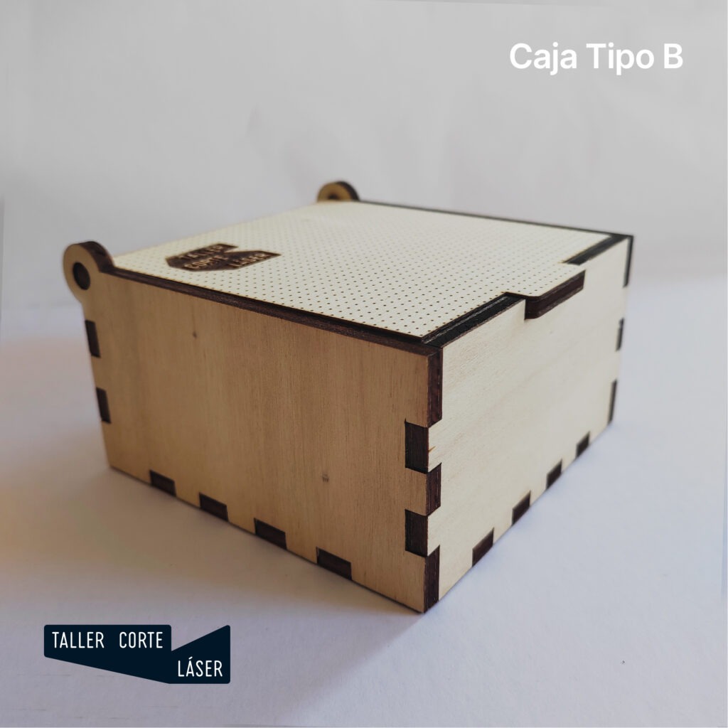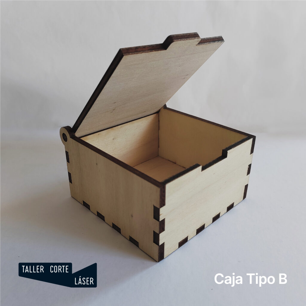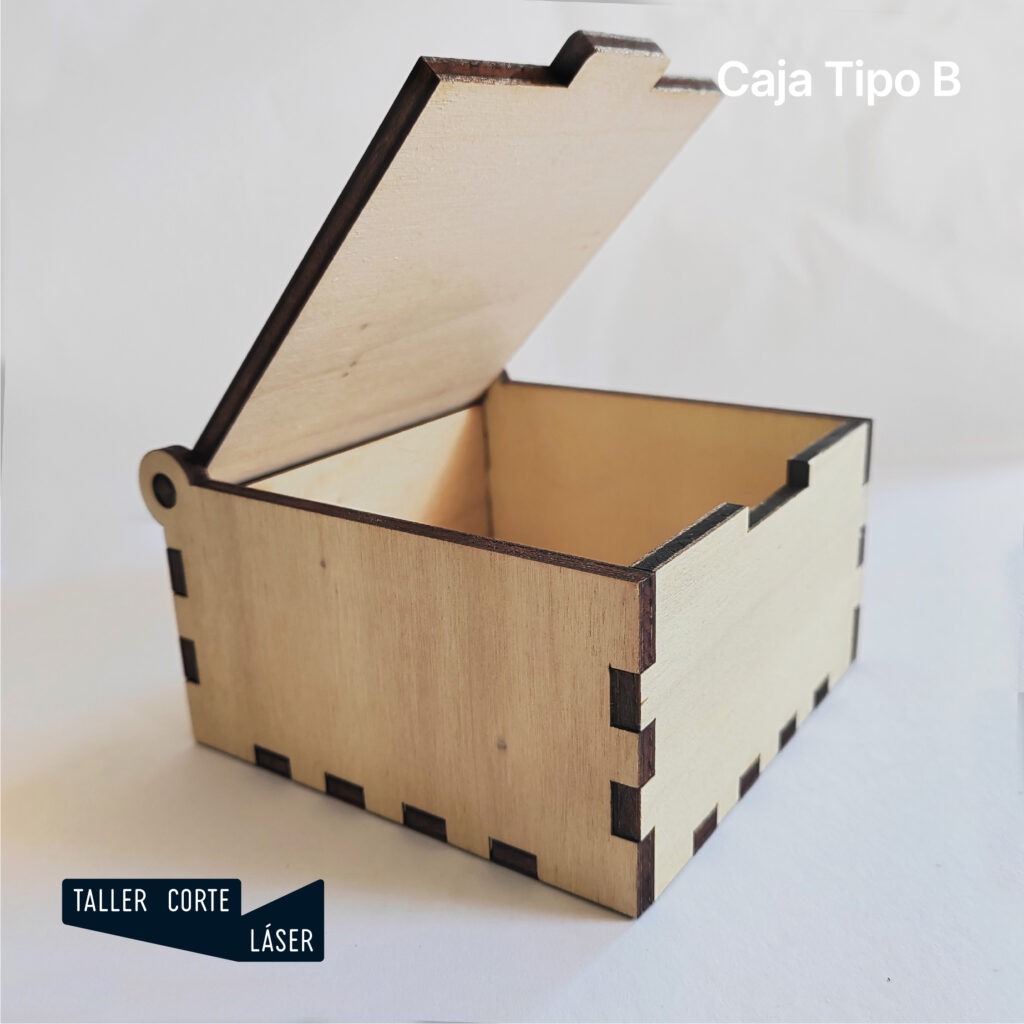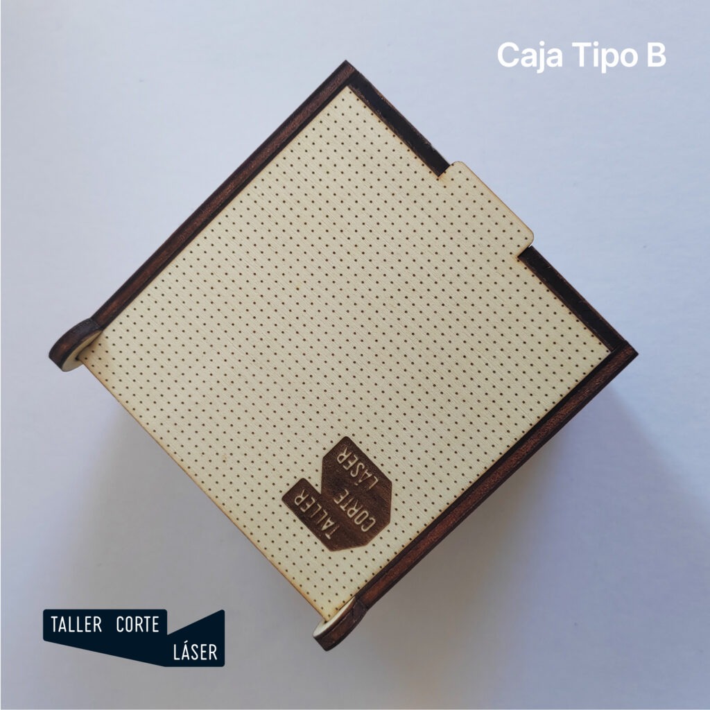 La caja tipo B es una caja de madera con la tapa giratoria mediante unas bisagras sencillas, incluye un grabado de 6 x 6 cm máximo en la tapa.