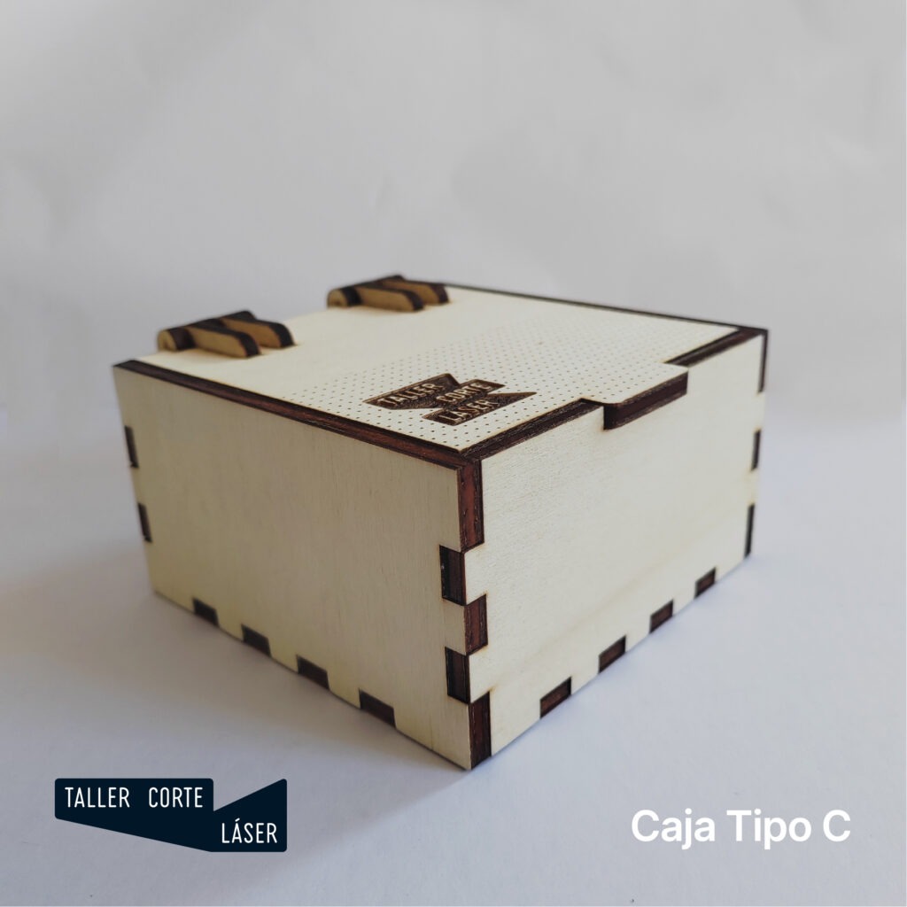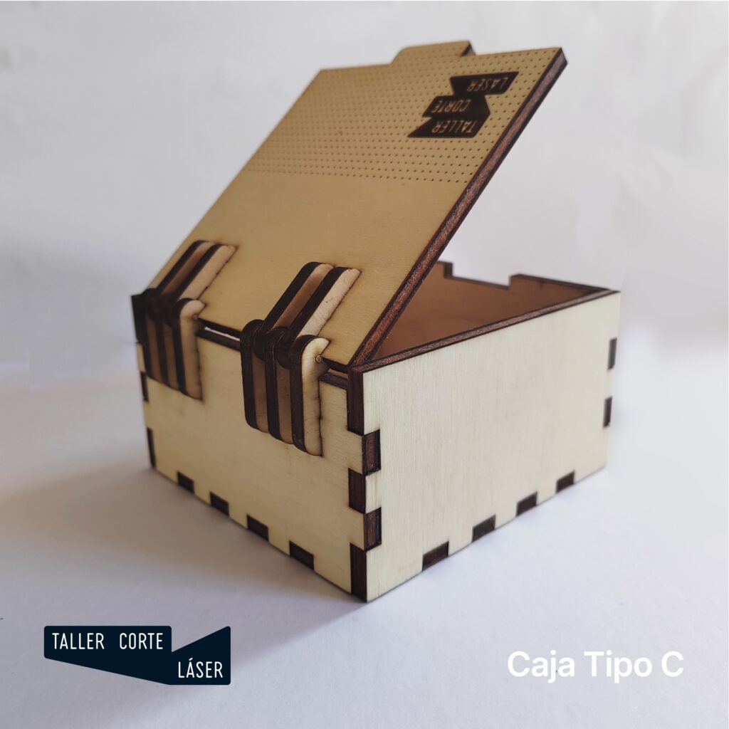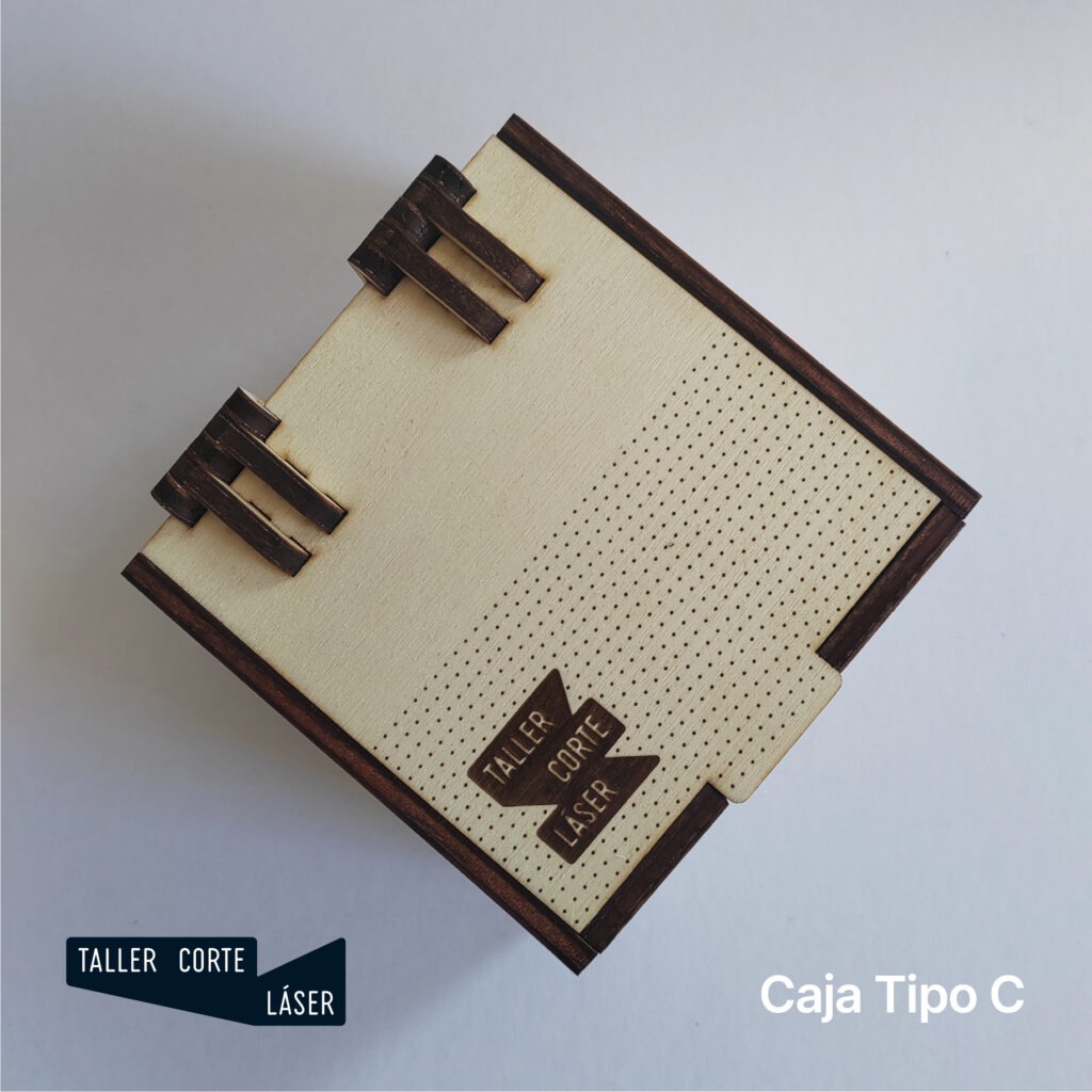 La caja tipo C es una caja de madera con la tapa giratoria mediante unas bisagras más complejas, incluye un grabado de 6 x 6 cm máximo en la tapa.