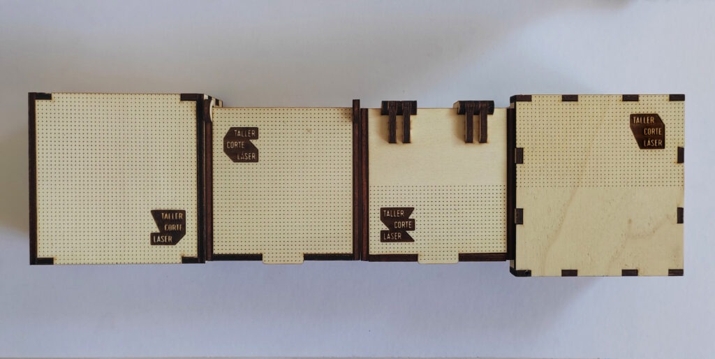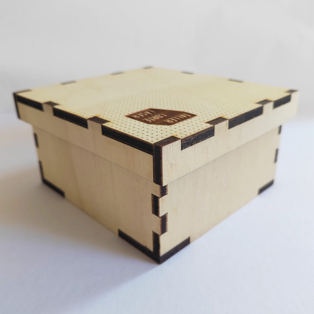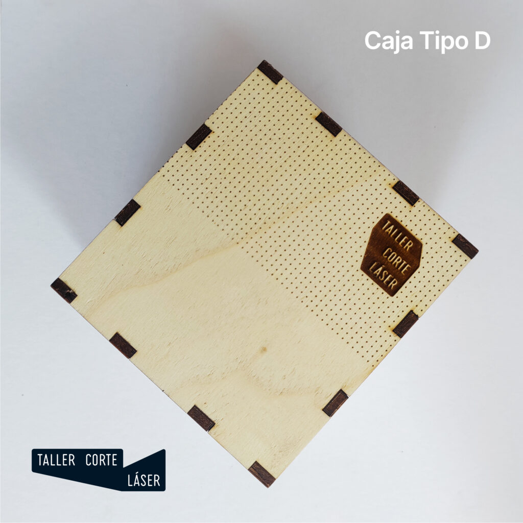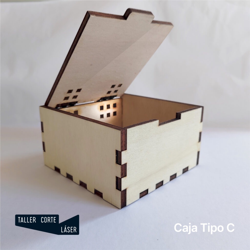 La caja tipo C es una caja de madera con la tapa giratoria mediante unas bisagras más complejas, incluye un grabado de 6 x 6 cm máximo en la tapa.