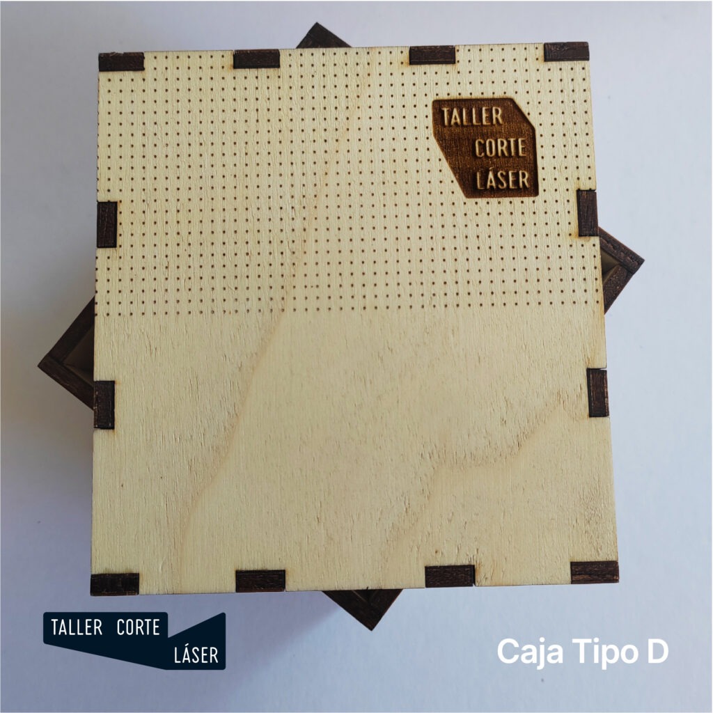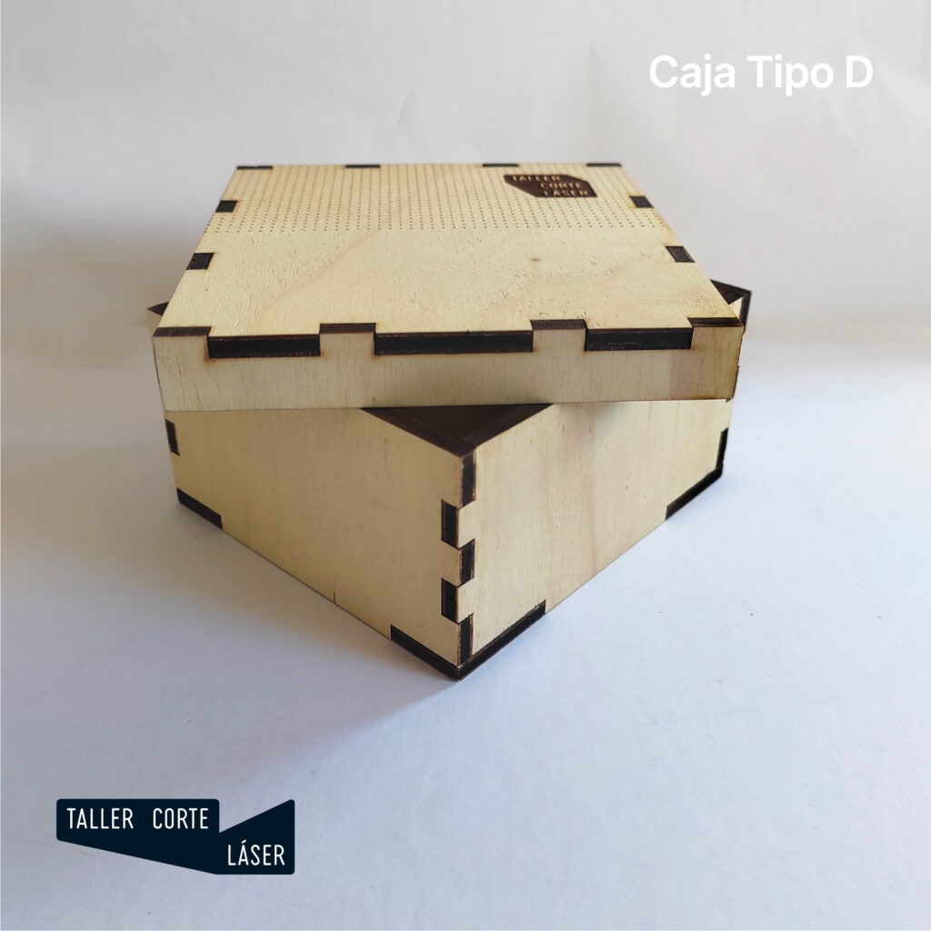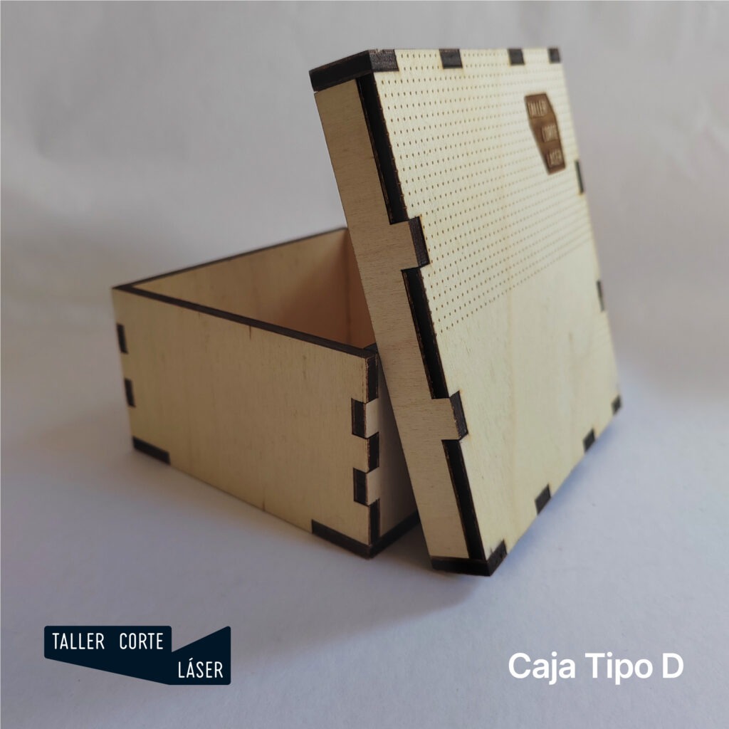 La caja tipo D es una caja de madera con la tapa de madera completamente removible, incluye un grabado de 6 x 6 cm máximo en la tapa.