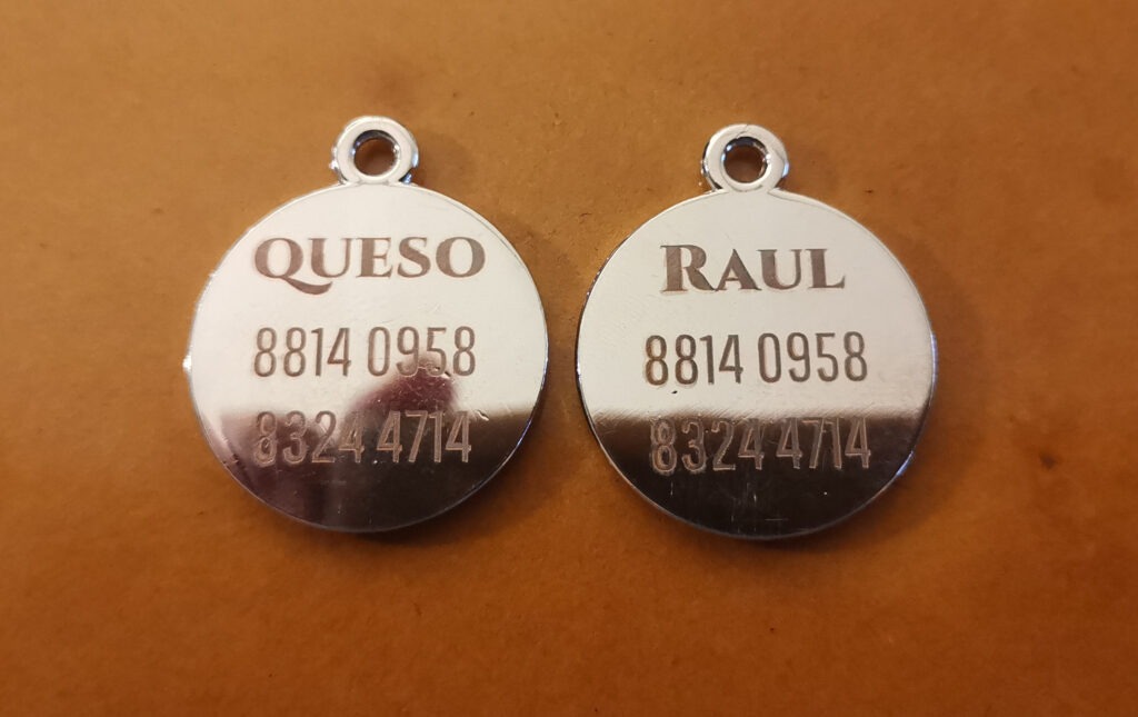 Grabado de medallas y placas para reconocimiento de mascotas como gatos y perritos.