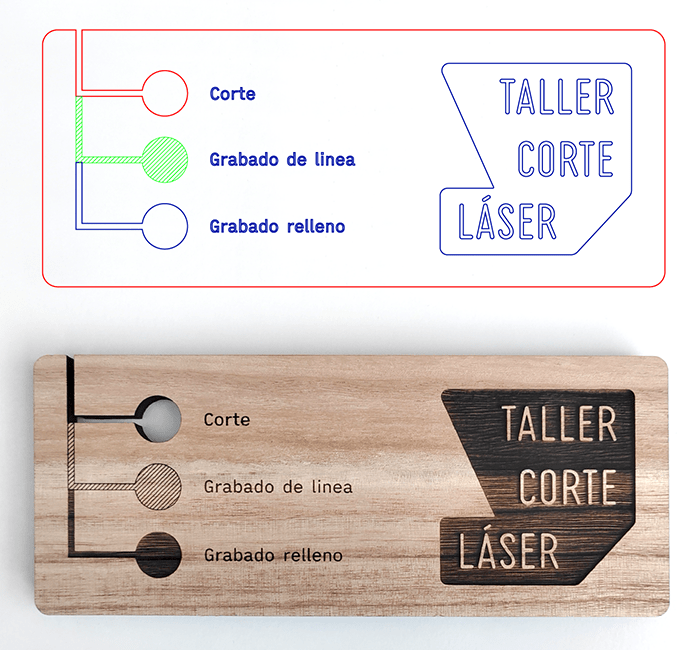 • Capas: corte (rojo), grabado de lineas (verde) y grabado relleno (azul)