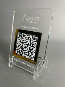 Hablador de acrílico transparente con logotipos en acrílico dorado y grabado directo. Incluye el precio de diseño de producto. Pregunte por nuestro precio de más de 10 unidades